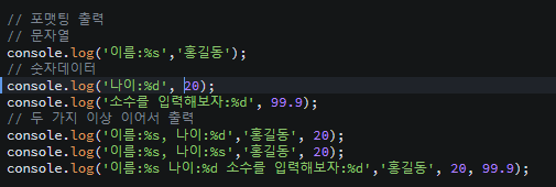console.log('이름:%s 나이:%d 소수를 입력해보자:%d','홍길동', 20, 99.9);