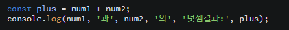 console.log(num1, '과', num2, '의', '덧셈결과:', plus);
