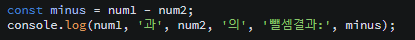console.log(num1, '과', num2, '의', '뺄셈결과:', minus);